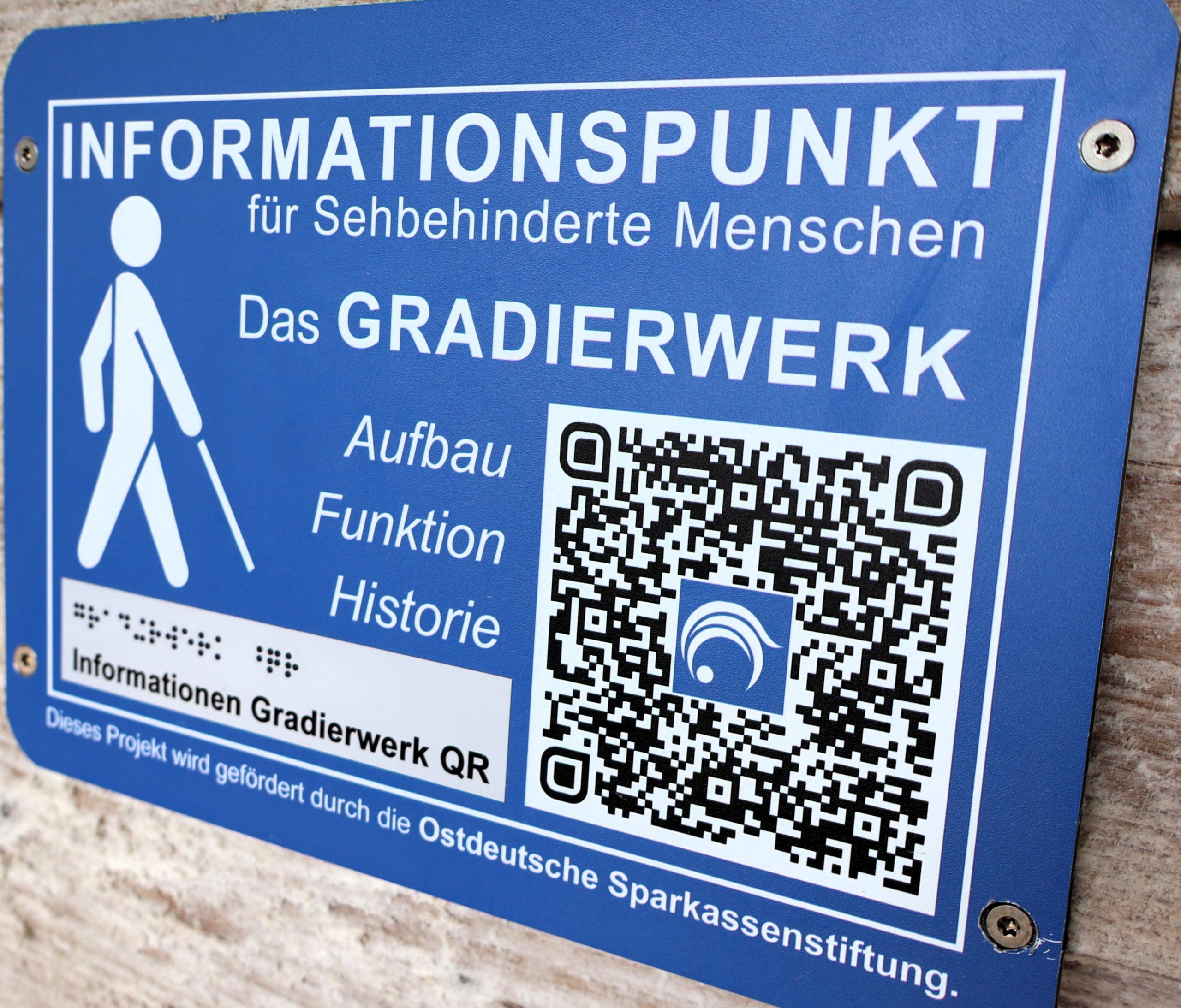 Zusätzlich wurde am Modell eine Informationstafel (IT) angebracht, wo neben einem allgemeinen Informationstext und Projektbeschreibung über den Scan eines QR-Code und erhabener Profilschrift Sehbehinderte die Möglichkeit eines direkten Abrufes von Informationen in Form von Audiodateien (ein Sprecher/-in erzählt die entsprechenden Informationen zum Modell des Gradierwerkes) haben. Der Solequell (und der Weg hinein) ist Behindertengerecht zugänglich.