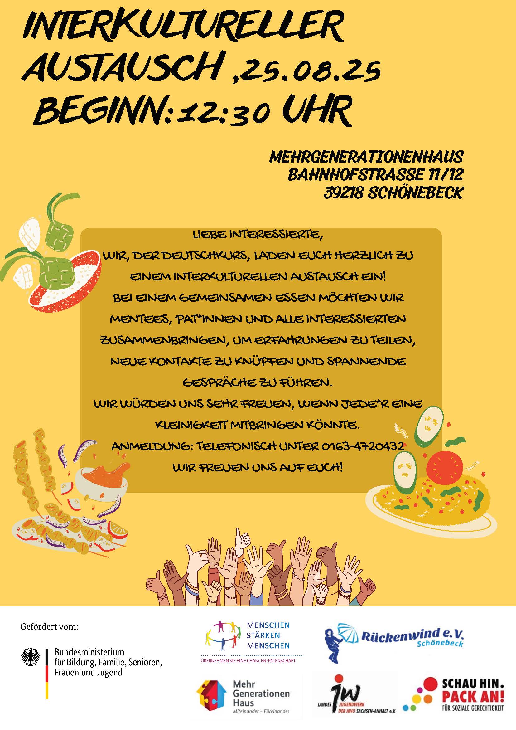 Die Mitglieder des Deutschkurses laden für Montag, 25.08.2024, ab 12:30 Uhr, alle Bürgerinnen und Bürger ganz herzlich zum „Interkulturellen Austausch mit Buffet“ in das Mehrgenerationenhaus, Bahnhofstr. 11/12, 39218 Schönebeck (Elbe) ein. Bei einem gemeinsamen Essen möchten die Mentees Patinnen und Paten sowie alle Interessierten zusammenbringen, um Erfahrungen zu teilen, neue Kontakte zu knüpfen und spannende Gespräche zu führen. Die Organisatoren freuen sich auf einen schönen Nachmittag mit vielen aufgeschlossenen Besucherinnen und Besuchern und wären sehr dankbar, wenn jeder Teilnehmende eine kleine Leckerei zum Buffet beitragen könnte. Um vorherige telefonische Anmeldung wird gebeten unter: 0163-4720432.