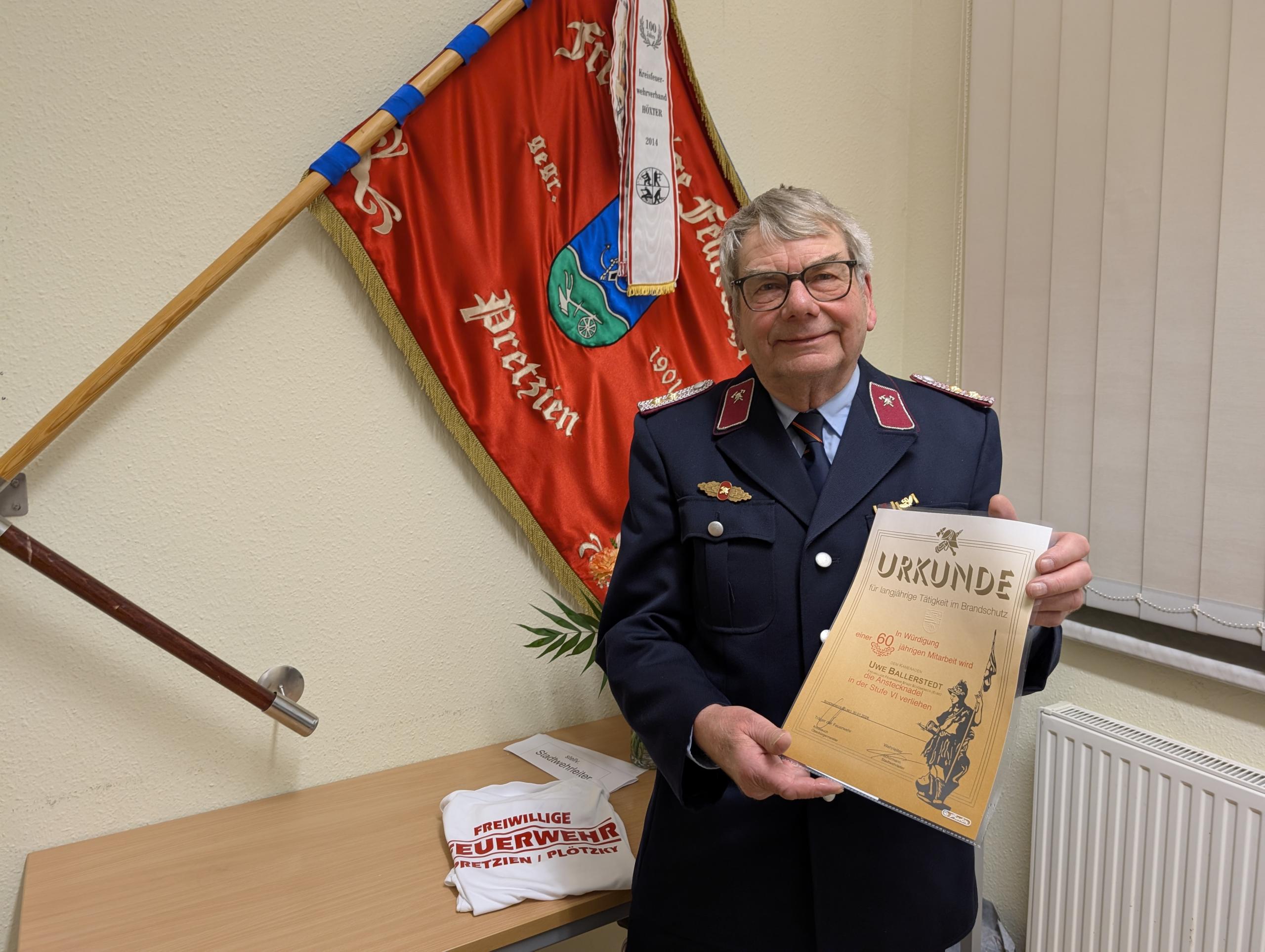 Am Freitagabend gab es eine besondere Auszeichnung. Kamerad Uwe Ballerstadt, über viele Jahre auch Wehrleiter, wurde in Würdigung einer 60-jährigen Mitarbeit mit der Anstecknadel in der Stufe VI ausgezeichnet. Dafür gab es eine Urkunde von der Stadt sowie einen üppigen Präsentkorb der Feuerwehr und des Fördervereins sowie ein personalisiertes T-Shirt.