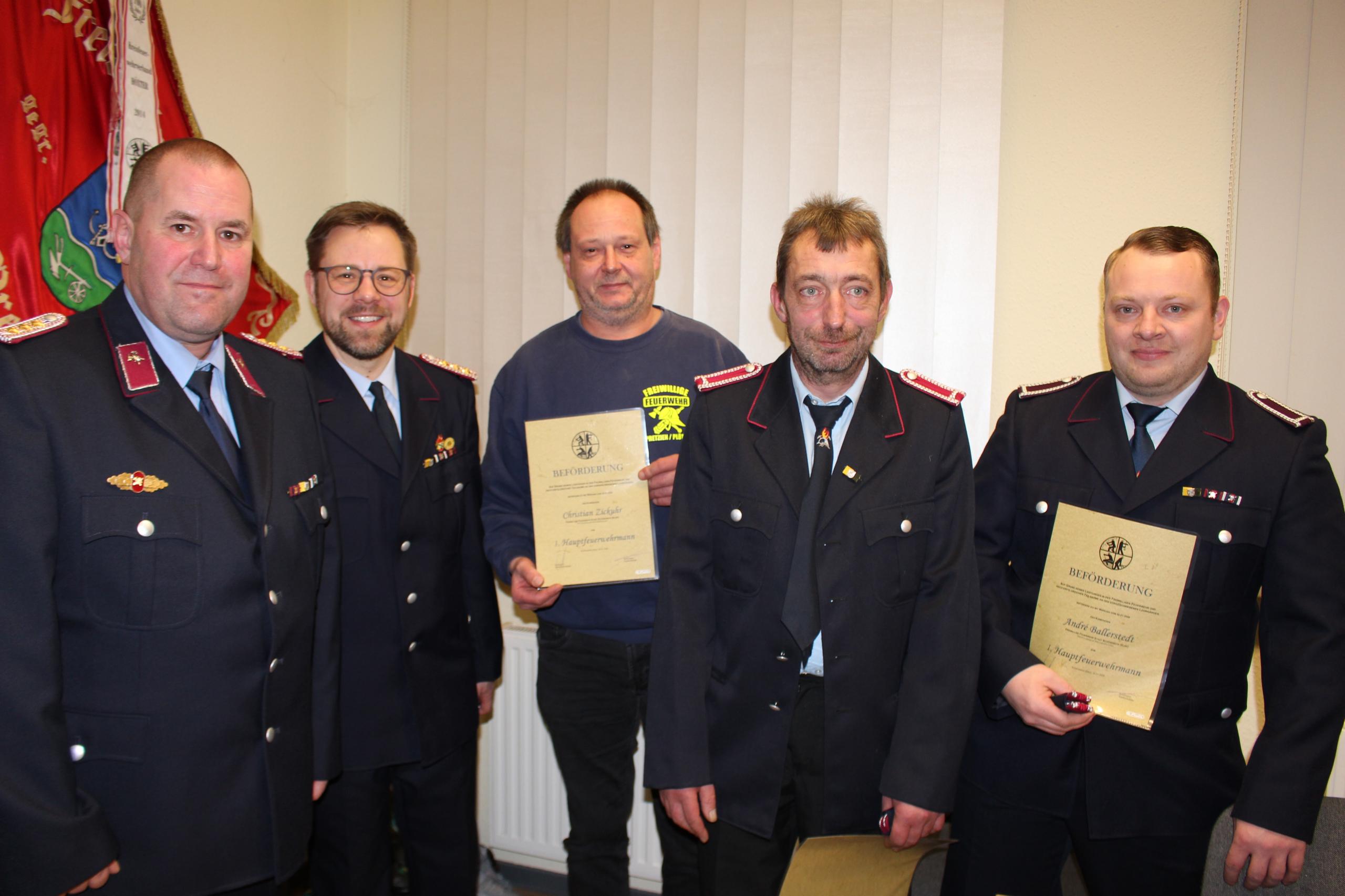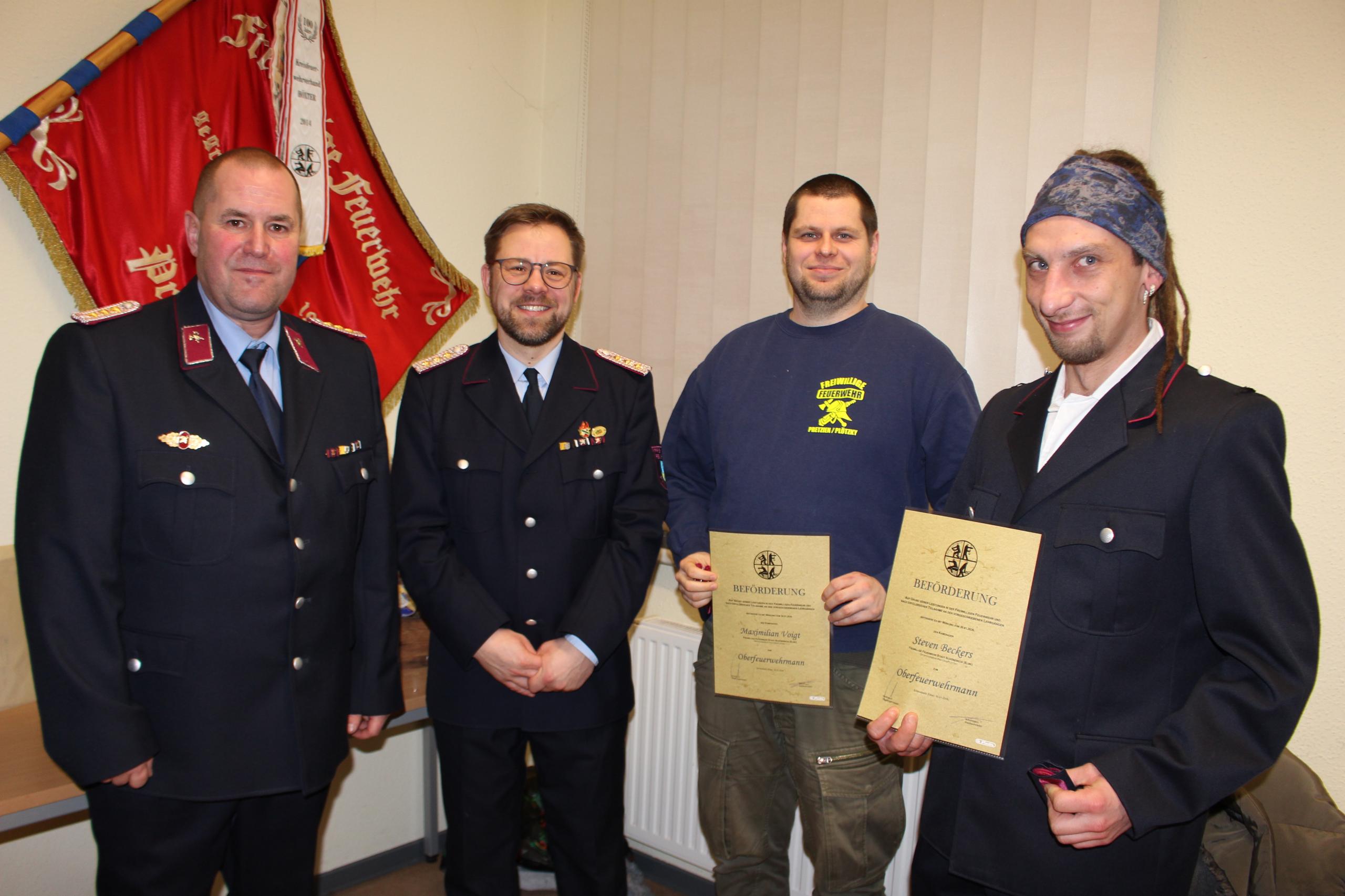 Zur Jahreshauptversammlung der Ortsfeuerwehr Pretzien/Plötzky hatten sich am Freitag, 30. Januar 2026, die Kameraden im Feuerwehrgerätehaus Pretzien eingefunden. Ortswehrleiter Michael Vorwerk begrüßte die anwesenden Teilnehmer und Gäste und sprach in seinem Rechenschaftsbericht von einem eher ruhigen Jahr für die zentrale Stützpunktwehr in Ostelbien. Insgesamt musste die Ortsfeuerwehr zu 18 Einsätzen ausrücken. Allein fünf Brände mussten bekämpft und 13 technische Hilfeleistungen gegeben werden. In erster Linie sind die Flächenbrände und Sturmschäden in Erinnerung geblieben, die insbesondere das Naherholungsgebiet heimsuchten. Aber nicht nur bei den Einsätzen konnte sich Michael Vorwerk auf die derzeit 36 aktiven Kameraden verlassen. Insgesamt wurde im vergangenen Jahr eine durchschnittliche Einsatzstärke von elf Kameraden am Tage erreicht, abends, nachts und am Wochenende waren es sogar 20 Einsatzkräfte. „Damit konnten wir unsere 24-Stunden-Bereitschaft weiterhin ausbauen“, so Michael Vorwerk. Auch bei den zahlreichen Dienstabenden, Schulungen und Lehrgängen waren sie erfolgreich dabei, um die Einsatzfähigkeit der Ortsfeuerwehr zu erfüllen und eine 24-Stunden-Bereitschaft sicher zu stellen. Insgesamt standen 26 Dienstabende mit 104 Stunden auf dem Statistikpapier.