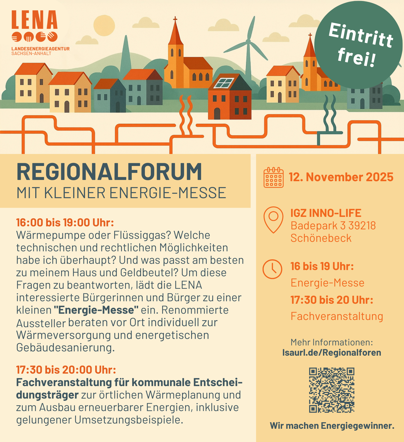 Am Mittwoch, den 12. November 2025, lädt die Landesenergieagentur Sachsen-Anhalt (LENA) im Rahmen des Regionalforums „Wärmezukunft nach Plan“ interessierte Bürgerinnen und Bürger aus der Region von 16 bis 19 Uhr zu einer kleinen Energie-Messe im IGZ INNO-LIFE im Kurpark Schönebeck/Bad Salzelmen ein.