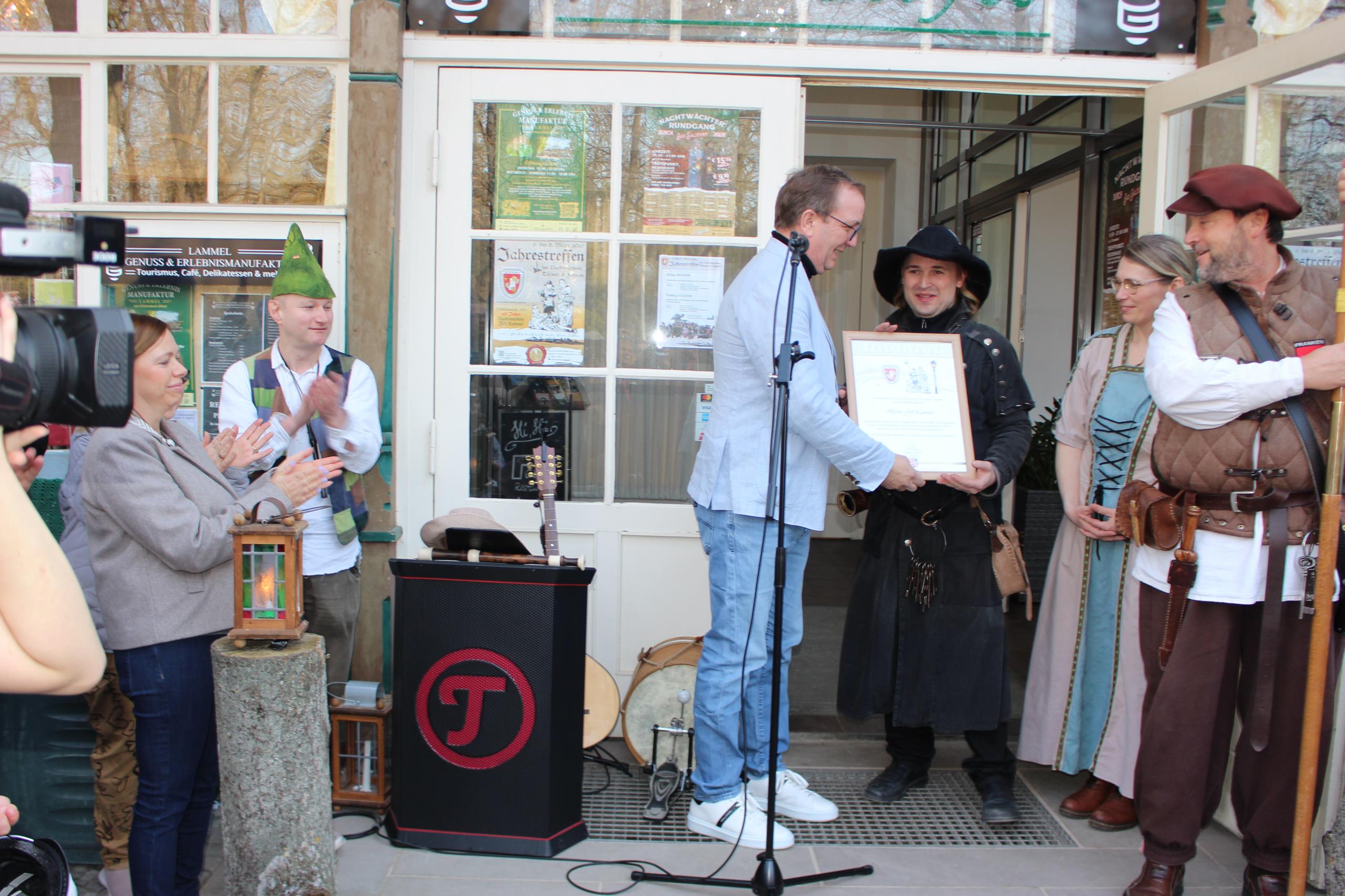 Jeff Lammel feierte in diesem Jahr sein 20-jähriges Jubiläum als Nachtwächter der Stadt. Zu diesem Anlass gratulierten ihm die Vertreter von Stadt, Landkreis und Land persönlich.