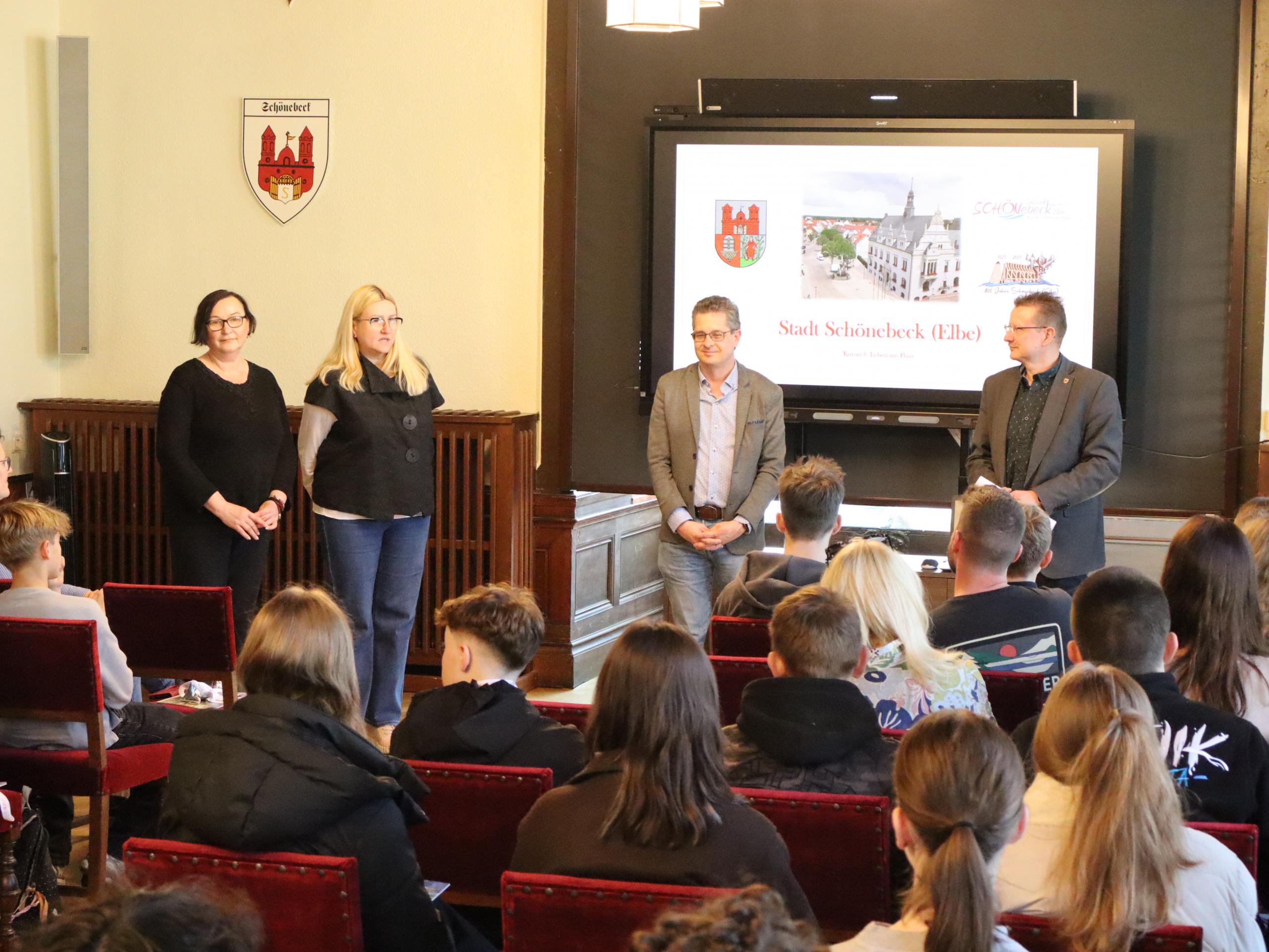 In seiner Begrüßung stellte Uwe Scholz den Schülerinnen und Schülern die bewegte Geschichte der Stadt Schönebeck (Elbe) vor und ging insbesondere auf die Entstehung der partnerschaftlichen Beziehungen zur litauischen Partnerstadt Trakai ein. Dabei betonte er die Bedeutung internationaler Begegnungen für das gegenseitige Verständnis und den kulturellen Austausch.
