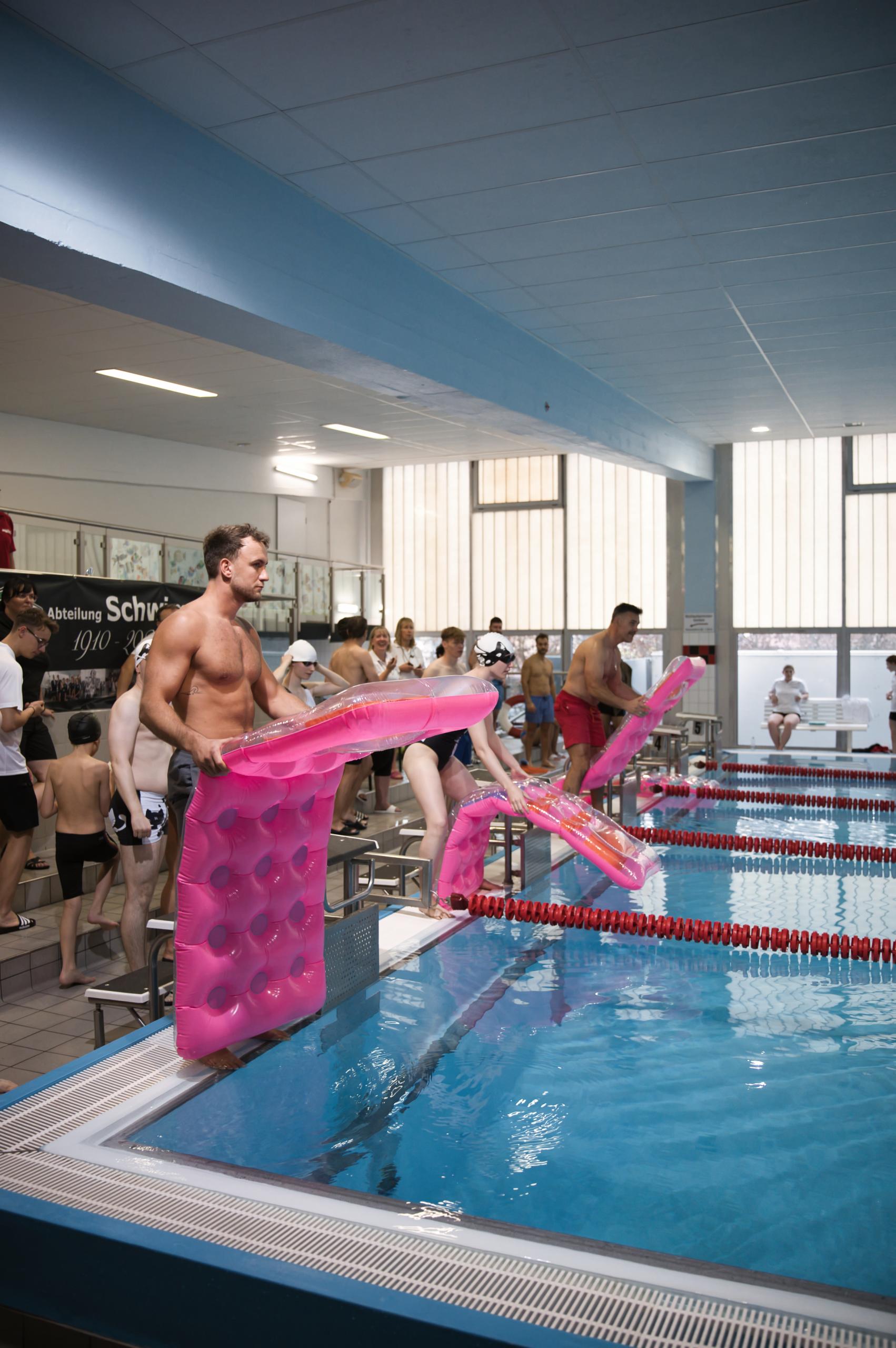 Jedes Team bestand aus mindestens vier Personen, die sich die unterschiedlichen Strecken aufteilten. Egal ob Profi oder Anfänger, die Teams waren mit Begeisterung dabei. Die Wettbewerbe wurden in verschiedenen Schwimmstilen und Distanzen ausgetragen. Besonders spannend war, als die Luftmatratzen-Rallye angepfiffen wurde. Hier zeigten sich nicht nur die sportlichen Fähigkeiten, sondern auch Geschicklichkeit, Gleichgewicht und Körperbeherrschung.