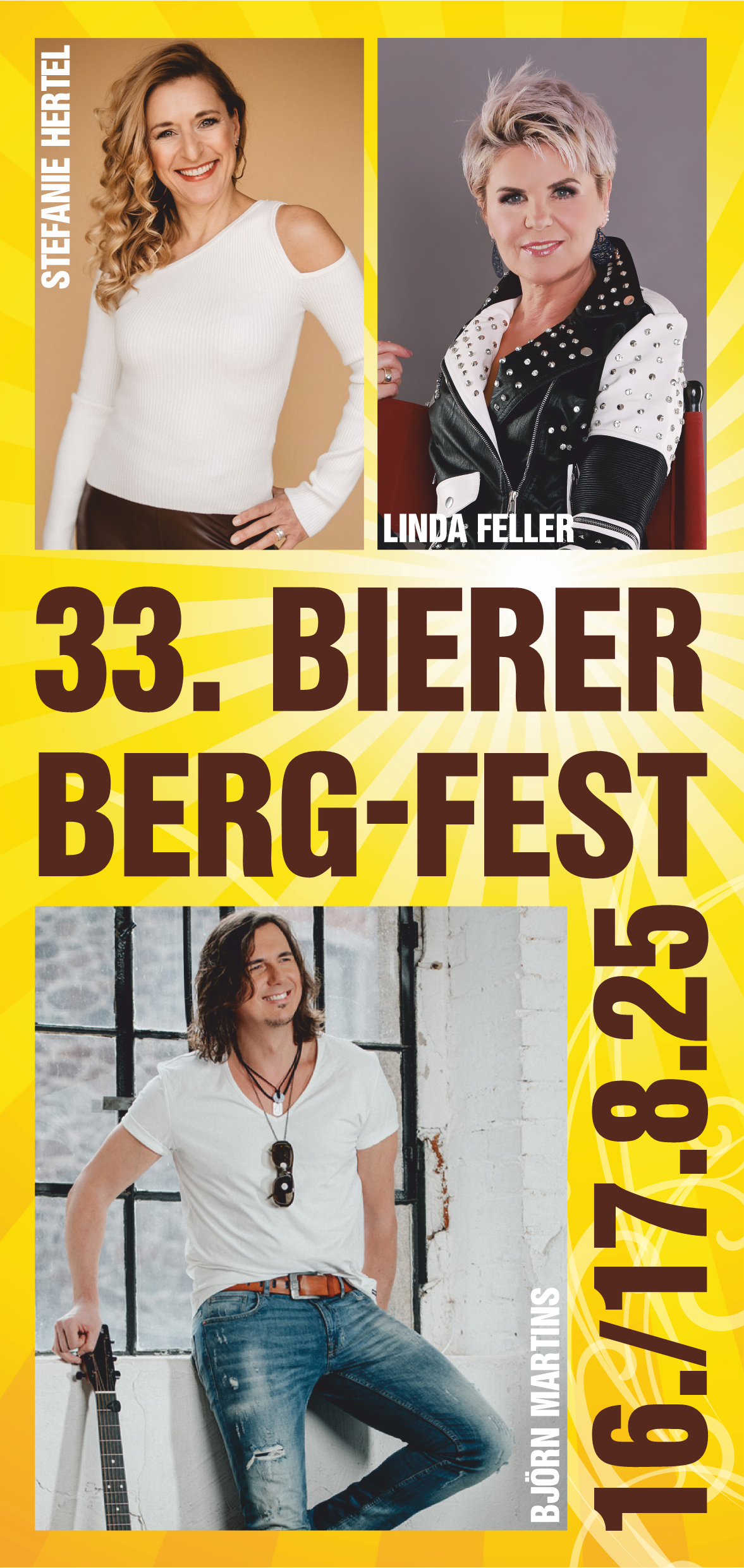 Samba-Rhythmen und Schlager-Sternchen: Die Mischung beim 33. Bierer-Berg-Fest ist vielfältig. Neben bekannten Größen wie Stefanie Hertel, Linda Feller und Björn Martins unterhalten beispielsweise „Banda Aipalé“ – eine Samba-Trommel-Show – sowie „Saxlust“ mit ihren Saxophonen und die Rock ‘n Roll-Band „Pippi and the 50’s Boy“, die für die Band "Lampenfieber" am Sonntagvormittag einspringt.