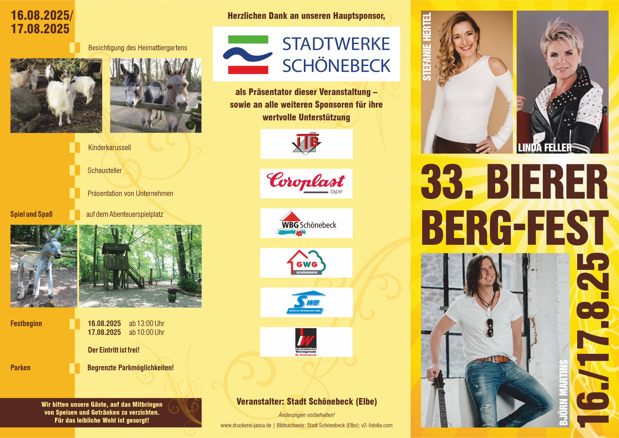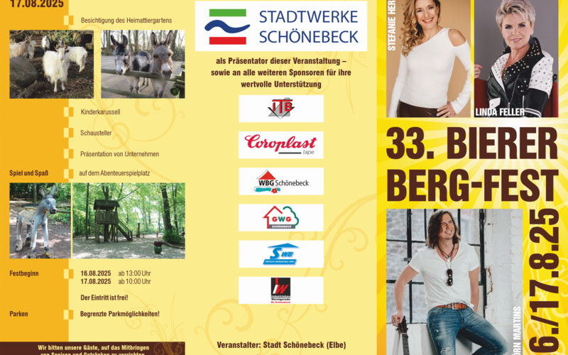 Der Programmflyer kann auf der Website der Stadt Schönebeck (Elbe) unter https://www.schoenebeck.de/datei/anzeigen/id/96690,1274/flyer_bbf_2025.pdf angesehen werden. Die Veranstaltungszeiten sind am Samstag, 16.08.2025, von 13 bis 20 Uhr und am Sonntag, 17.08.2025, von 10 bis 18 Uhr.