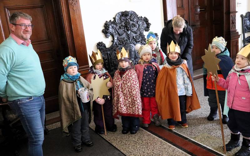 Oberbürgermeister Bert Knoblauch begrüßte gestern Kinder der Kita Marienheim. Die jungen Sternsinger segneten das Rathaus und alle Menschen, die dort ein- und ausgehen. Dafür bedankte sich das Stadtoberhaupt herzlich, gleichzeitig wurde der sichtbare Segen über der Eingangstür zum Sprechzimmer erneuert. Mit "Schneeflöckchen, Weißröckchen" verabschiedeten sich die Kinder alsbald und zogen weiter.