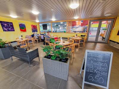 Genießen Sie in aller Ruhe Speisen, Getränke, Kaffee und frisch gebackenen Kuchen in Straßenkleidung. Bestellen Sie bequem über die Tischklingel und zahlen Sie unkompliziert bar.