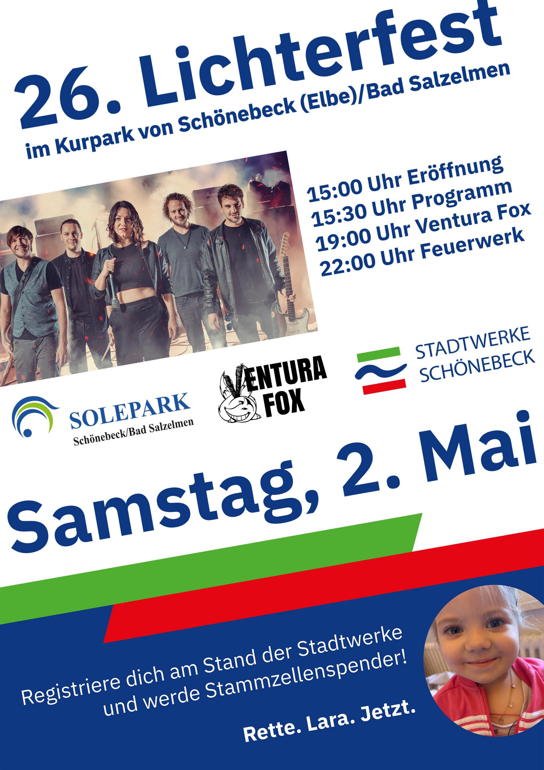 Unter dem Motto „Leben retten auf dem Lichterfest“ führen die Stadtwerke Schönebeck von 15:00 bis 18:00 Uhr eine Typisierungsaktion durch. Die Registrierung ist einfach, schmerzfrei und für Sie kostenlos. Als Dankeschön erhält jeder neu registrierte Spender einen Verzehrgutschein.