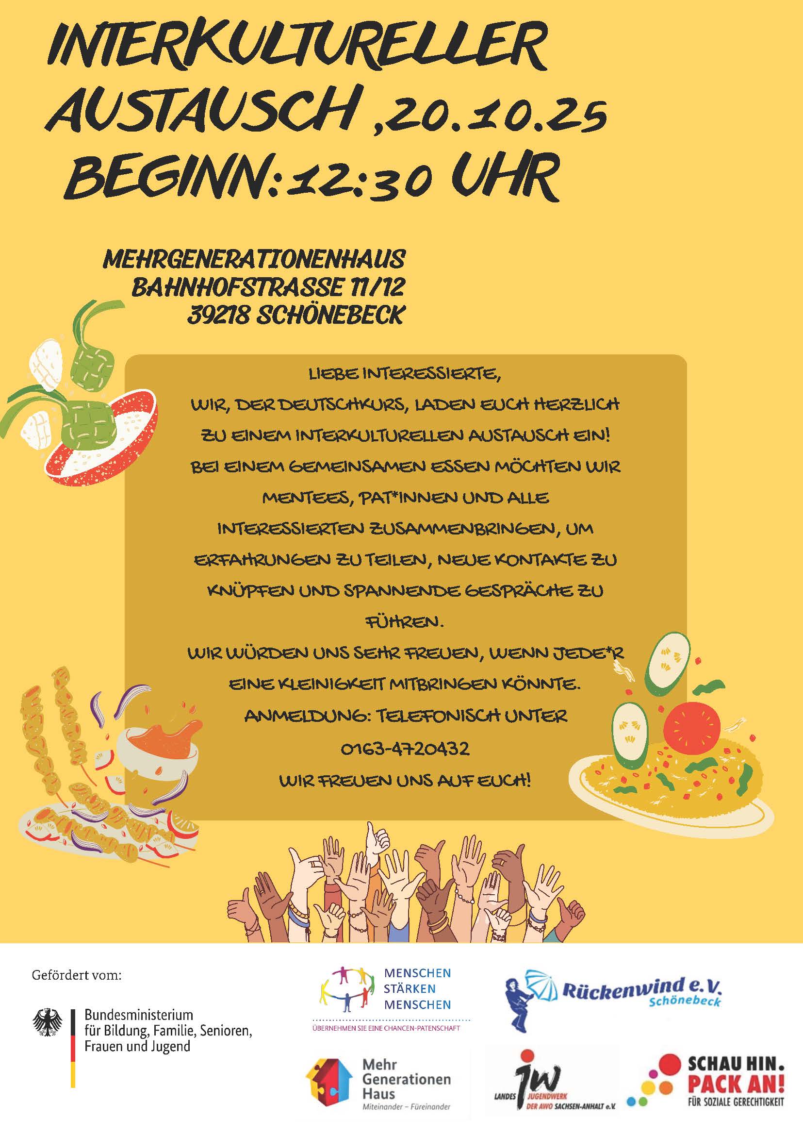 Die Mitglieder des Deutschkurses laden für Montag, 20.10.2025, ab 12:30 Uhr, alle Bürgerinnen und Bürger ganz herzlich zum „Interkulturellen Austausch mit Buffet“ in das Mehrgenerationenhaus, Bahnhofstr. 11/12, 39218 Schönebeck (Elbe) ein. Bei einem gemeinsamen Essen möchten die Mentees Patinnen und Paten sowie alle Interessierten zusammenbringen, um Erfahrungen zu teilen, neue Kontakte zu knüpfen und spannende Gespräche zu führen. Die Organisatoren freuen sich auf einen schönen Nachmittag mit vielen aufgeschlossenen Besucherinnen und Besuchern und wären sehr dankbar, wenn jeder Teilnehmende eine kleine Leckerei zum Buffet beitragen könnte. Um vorherige telefonische Anmeldung wird gebeten unter: 0163-4720432