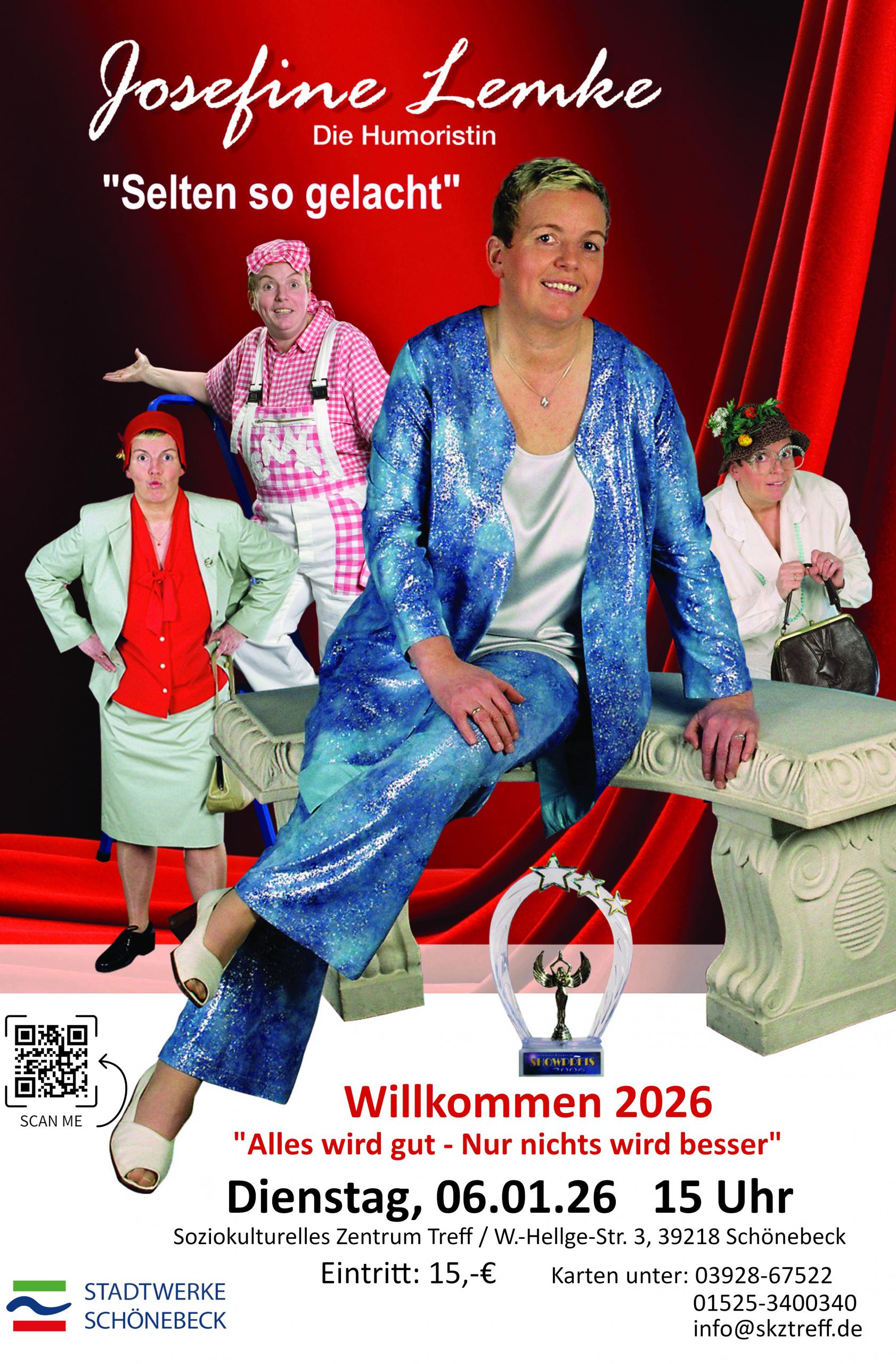 Humoristin Josefine Lemke, diesmal Solo unterwegs lässt zum Anfang des Jahres auf humoristische Weise die Korken knallen. Sie schlüpft in die Rolle der Erna Schmidtke-Hübenstein und fragt sich, was wird aus den Vorsätzen für das neue Jahr? Sicherlich wird alles gut, aber nur nichts besser. Dann vielleicht doch lieber das Horoskop befragen ? Dieser Nachmittag wird garantiert amüsant und unterhaltsam, auch weil an die großartige Helga Hahnemann erinnert wird. Getreu dem Motto: Neues Jahr, gleiches ich !