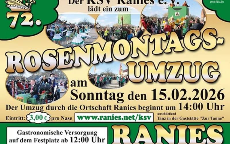 Das Traditionsgefühl und die Heimatverbundenheit der Ranieser werden in zahlreichen Festen zum Ausdruck gebracht. Dabei ist vor allem der Ranieser Rosenmontagsumzug als kultureller Höhepunkt für alle Karnevalsfreunde weit über die Landesgrenzen bekannt. Der Straßenkarneval beginnt um 14 Uhr. Anschließend findet der Tanz in der Gaststätte "Zur Tanne" statt. Die Gastronomische Versorgung auf dem Festplatz beginnt ab 12 Uhr. Für Speis und Trank vor, während und nach der dem Festumzug ist gesorgt. Bitte folgen sie den Einweisungen der Parkplatzordner(innen). Nähere Informationen unter: Kultur-und Sportverein Ranies e.V.